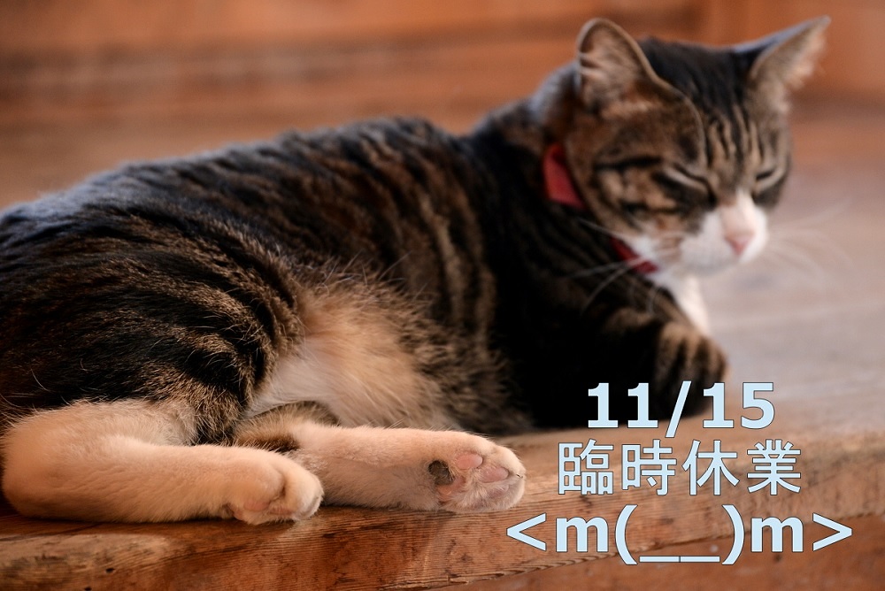 前日のお知らせとなってしまい大変申し訳ありませんが、明日11月15日(土)は、都合によりお休みとさせて頂きます。